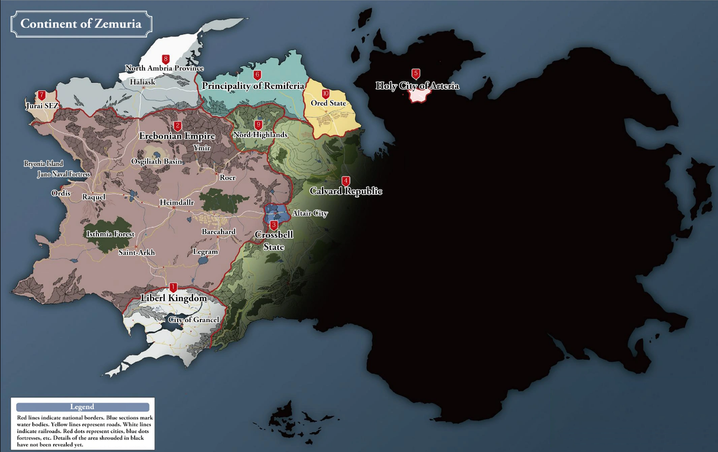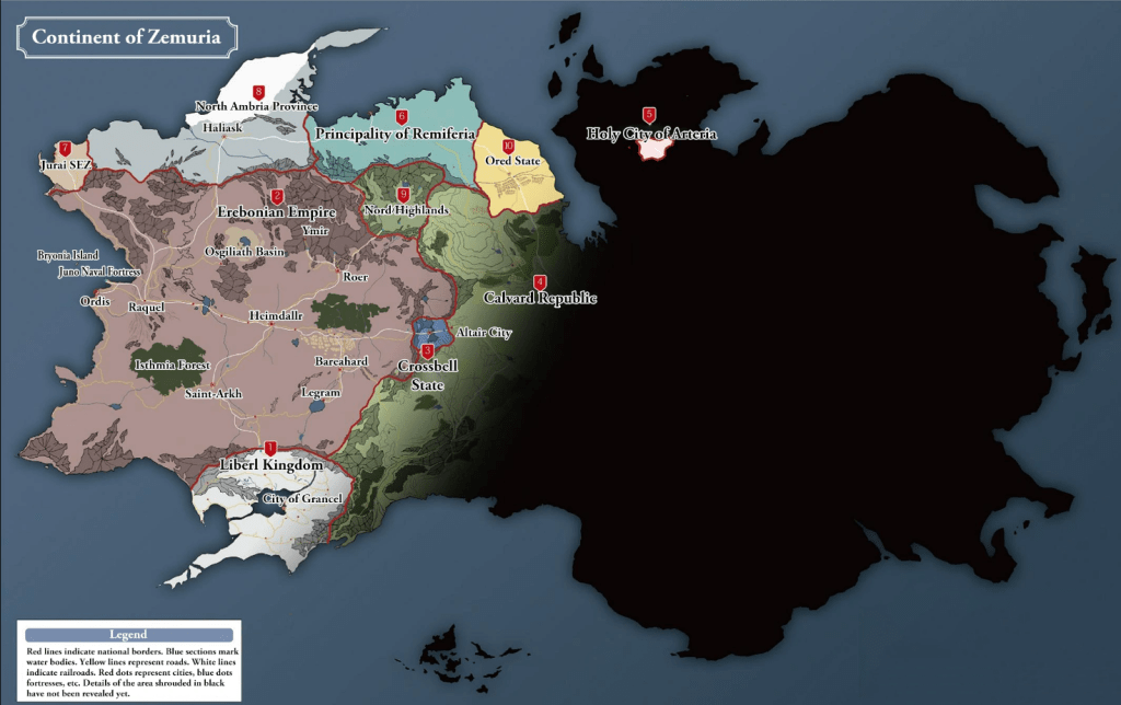 Resembling ours, Trails take place in the continent of Zemuria, which, as far as is known, is the only continent of the planet, surrounded from all directions by an ocean. The continent has been approximated to be the size of North America or Australia. With this knowledge, the whole planet can be called Zemuria if nothing new comes to light later. Falcom has not made the name background official, but Zemuria could, by all means, refer to the hypothetical lost continent of Lemuria or the Russian word for a world, zemlya.