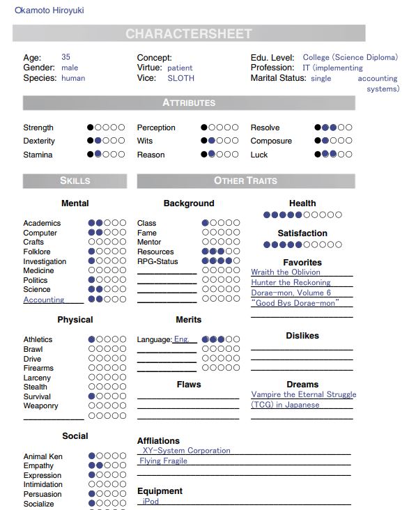 Kamm makes extensive use of interviews. The interview materials include character sheets that he asked his interviewees to fill out. The sheet is based on the World of Darkness character sheet, because it is familiar to most gamers and quite intuitive. This is one of the clear trends of 2020, because a similar sheet appeared in the Solmukohta book What Do We Do When We Play as a humorous self-evaluation form.